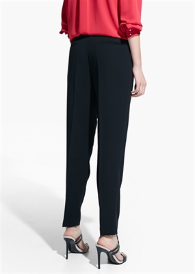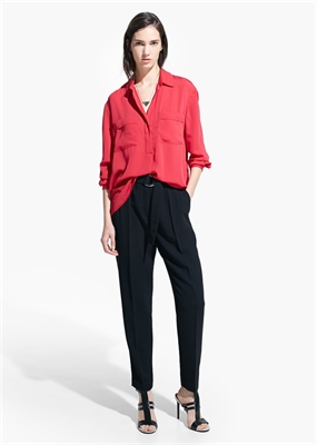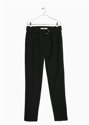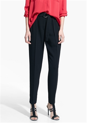 Pantalón fluido de crepé con dos bolsillos laterales. Cinturón desmontable con cierre de aros y trabillas, dos bolsillos de ribete en la parte posterior, cierre de gancho y cremallera.