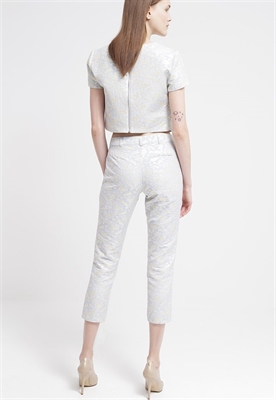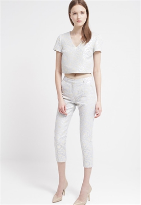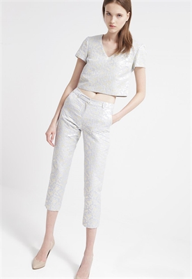 Largo entrepierna:64 cmModelo, altura:179 cm, lleva la talla 36Largo exterior de la pierna:85 cmCierre:cremallera invisibleBolsillos:lateralesEstampado:de floresCintura:normalMaterial exterior:49% poliéster, 30% algodón, 21% metalCuidados:lavar a máquina a 40 °C, no utilizar secadora, programa de lanaNúmero de artículo:MF921A005-K11