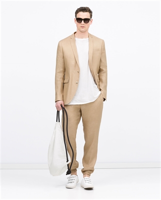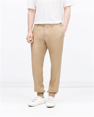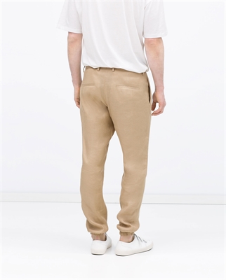 Pantalón arena lino viscosa. Elástico en puño ALTURA MODELO: 187 cm