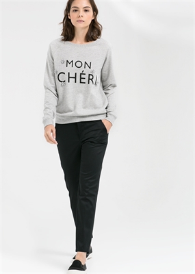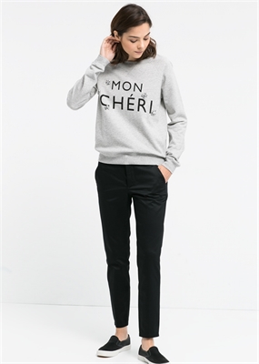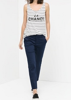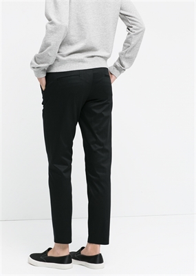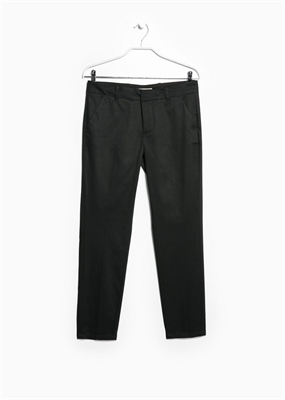 Pantalón pitillo de algodón en tejido elástico. Dos bolsillos laterales, dos bolsillos de ribete en la parte posterior, trabillas, cierre de cremallera y gancho.