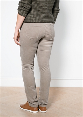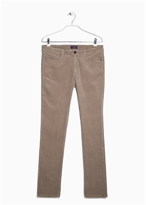 Pantalón de pana de tiro medio con cinco bolsillos, trabillas, cierre de cremallera y botón.