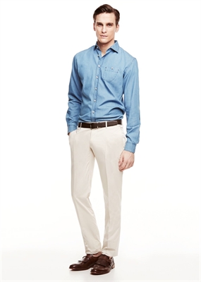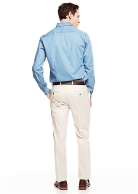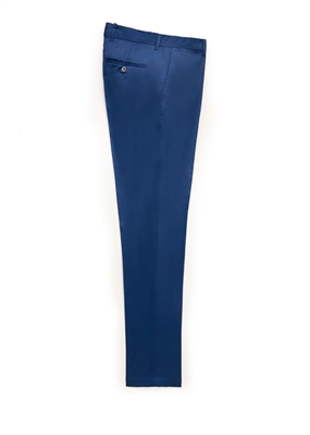 Pantalón slim-fit de traje en popelín de algodón que pertenece a la línea Premium. Dos bolsillos laterales y dos bolsillos de ribete con botón en la parte posterior. Trabillas, cierre de cremallera y botón.