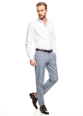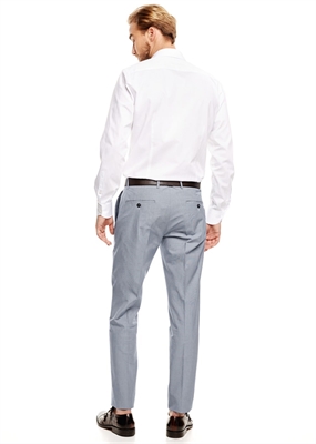Pantalón de traje de micro pata de gallo en algodón que pertenece a la línea Premium. Dos bolsillos laterales y dos bolsillos de ribete con botón en la parte posterior. Trabillas, cierre de cremallera y botones.