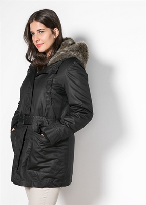 Parka encerada con interior acolchado desmontable con aplique de pelo. Capucha, manga larga, cierre de cremallera y botones a presión en la parte delantera. Cordón interior ajustable a la cintura, cinturón desmontable, trabillas y cuatro bolsillos.
