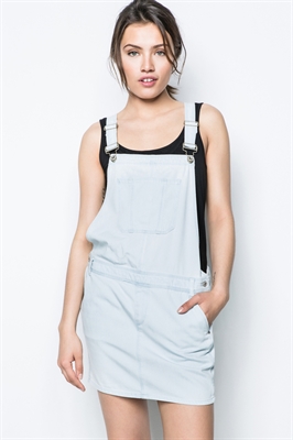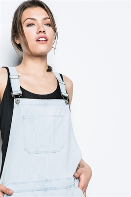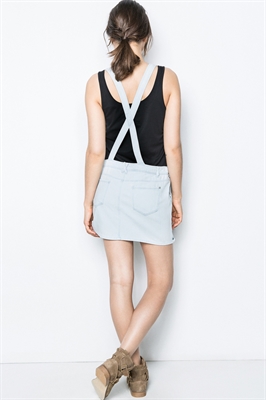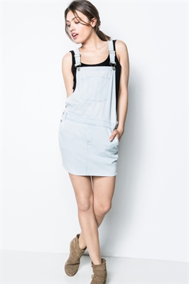 Peto vaquero con falda, bolsillo en la parte delantera superior, bolsillos laterales y bolsillos en la parte trasera.- Cierre con botones metalizados a los lados y al frente.