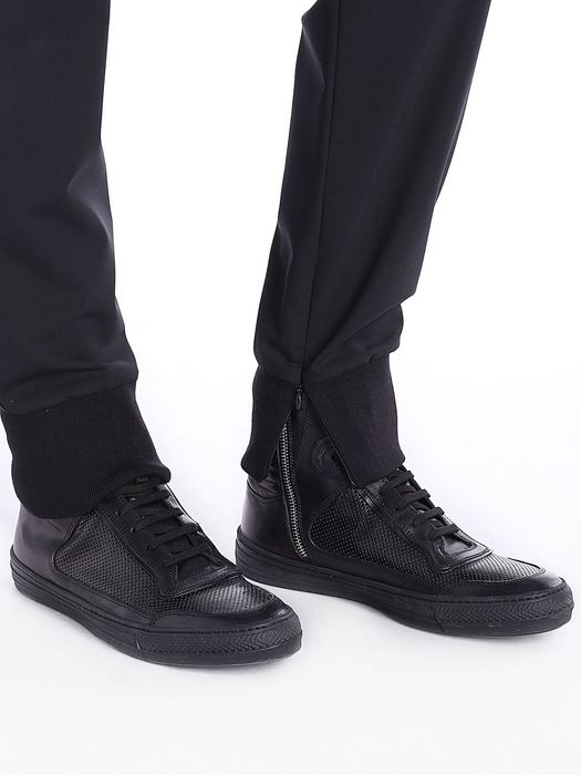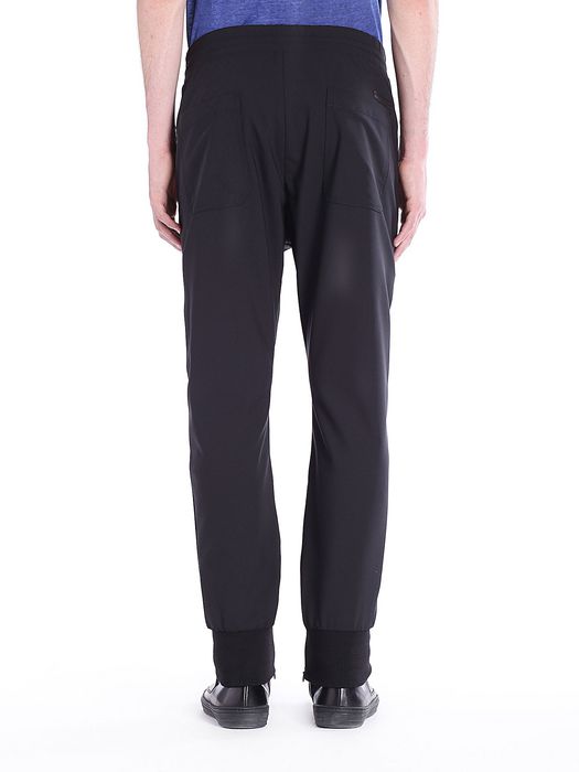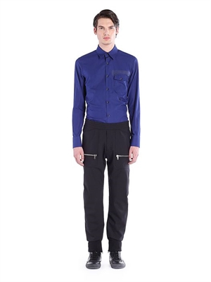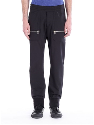 Stretch cool wool pants with drawstring and patch pockets on front with metal zips.