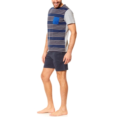 Suave conjunto de rayas con mucho estilo, perfecto para dormir. - Pijama corto de 2 piezas confeccionadas en punto de jersey - Camiseta demanga corta, cuello redondo, bolsillo en el pecho y con estampado de rayas en la parte delantera - Pantalón corto a juego de cintura elástica con cordón ajustable y bolsillo en la parte trasera - Largo de espalda (camiseta): 69 cm aproximadamente - Largo de entrepierna (pantalón corto): 19 cm; ancho del bajo: 32 cm aproximadamente - Nuestro modelo lleva una talla L y mide 1,87 mpijama: 98% algodon,2% viscosa MATERIA 2 90% algodon,10% viscosa pijama: 100% algodonLavable a máquina.