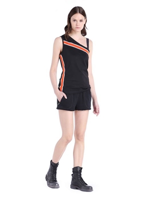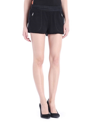 Elastic waistband, side zip pockets, two zip back pockets, metallic logo detail.