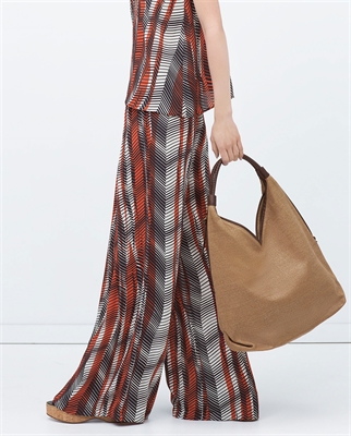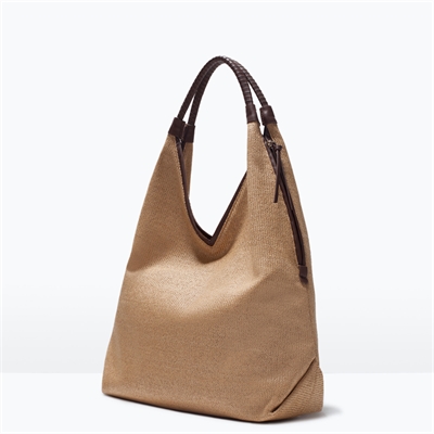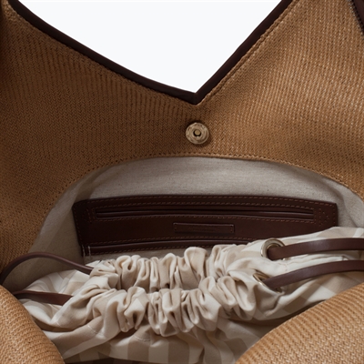 Bolso grande de rafia.Color arena. Detalle cremalleras en laterales. Asa rígida de hombro. Bolsa interior extraíble de tela. Forro con bolsillo interior.Cierre imantado. Medidas 47 x 35 x 14 cm.