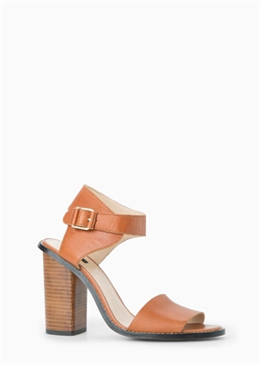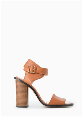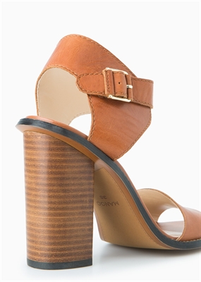 Sandalia de piel con tira ancha frontal y pulsera en el tobillo con cierre de hebilla. Tacón cuadrado de madera que mide 9,5 cm.