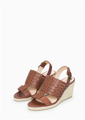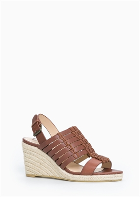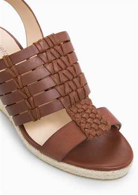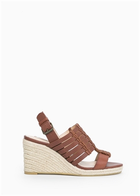 Sandalia de tiras múltiples en piel con detalles trenzados. Cuña de esparto y cierre de hebilla. La cuña mide aproximadamente 8 cm. Horma adaptada para mayor confort.