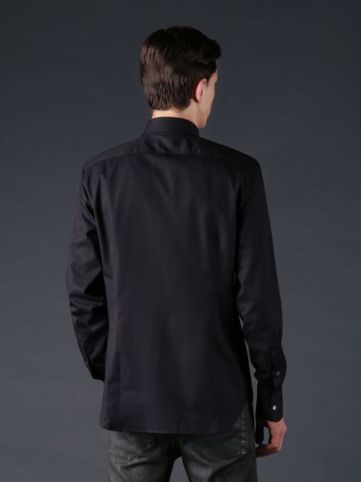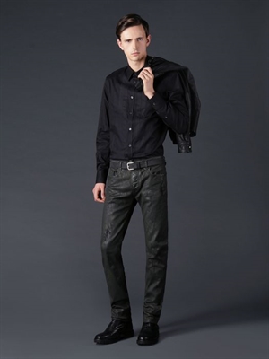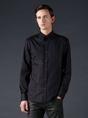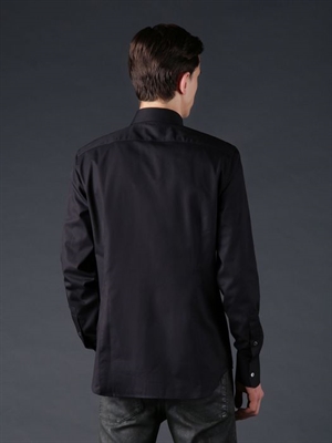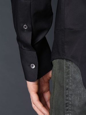 Intarsia embellishment in contrast fabric gives attitude to a classic cotton twill shirt.