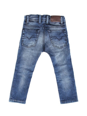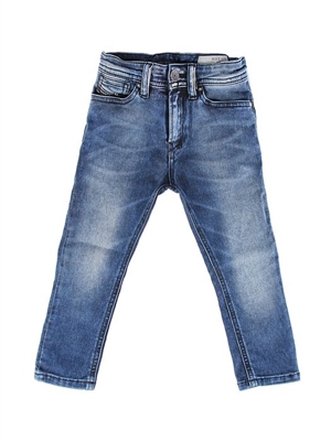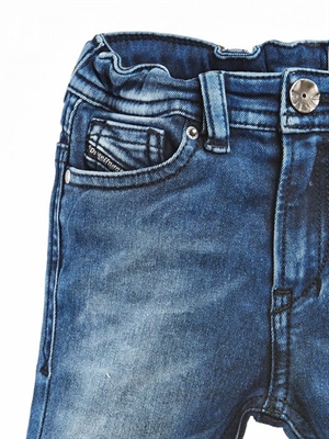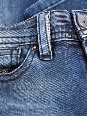 Superstretch treated blue denim, slim fit, side pockets, belt loop waistband.
