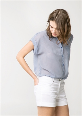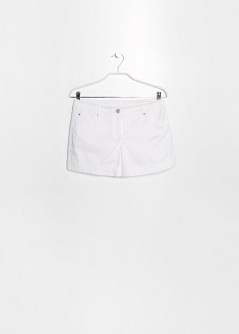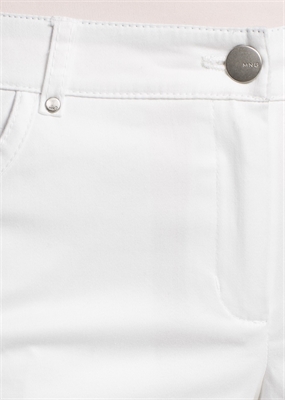 Short confeccionado en tejido elástico de algodón con dos bolsillos laterales y dos bolsillos de parche en la parte posterior. Trabillas, cierre de cremallera y botón, bajo con vuelta.