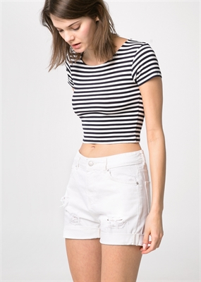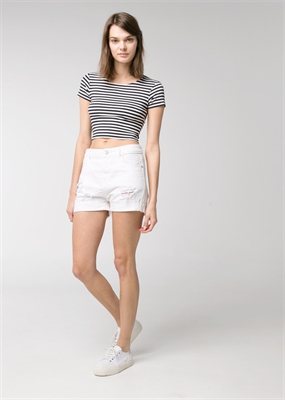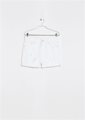 Short denim boyfriend en color blanco con rotos decorativos y bajo con vuelta. Cinco bolsillos, trabillas, cierre de cremallera y botón.