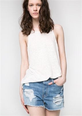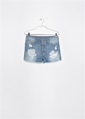 Short denim en lavado claro con rotos decorativos y forro interior de rayas. Cinco bolsillos, trabillas, cierre de cremallera y botón, bajo deshilachado con aberturas laterales.