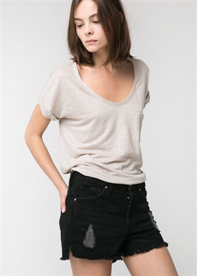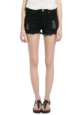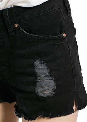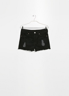 Short denim negro con rotos decorativos en contraste y bajo deshilachado con aberturas laterales. Cinco bolsillos, trabillas, cierre de cremallera y botón.