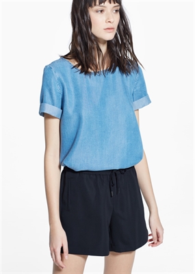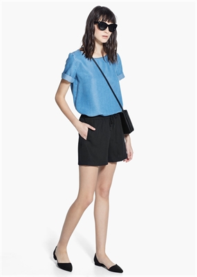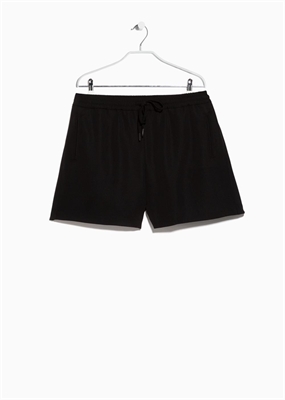 Short en tejido fluido. Cintura elástica con cordón para anudar y dos bolsillos de ribete en la parte delantera.