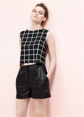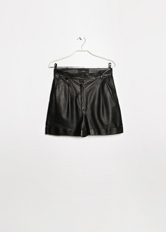 Short de tiro alto confeccionado en piel con pinzas en la parte delantera. Dos bolsillos laterales, dos bolsillos de ribete en la parte posterior y trabillas. Bajo con vuelta, cierre de cremallera y gancho.