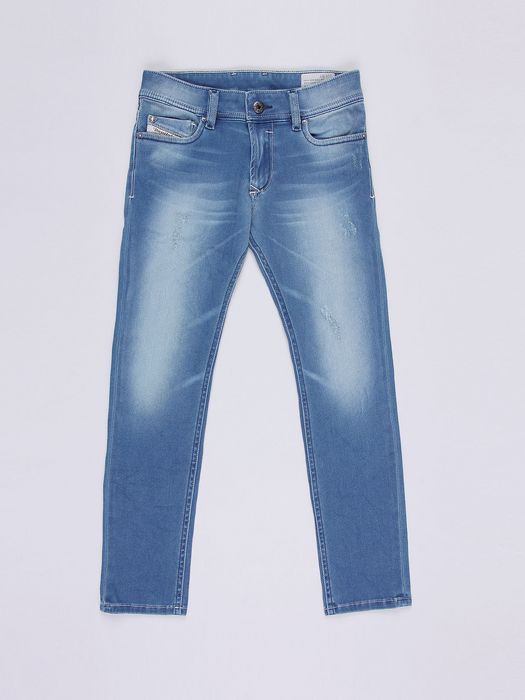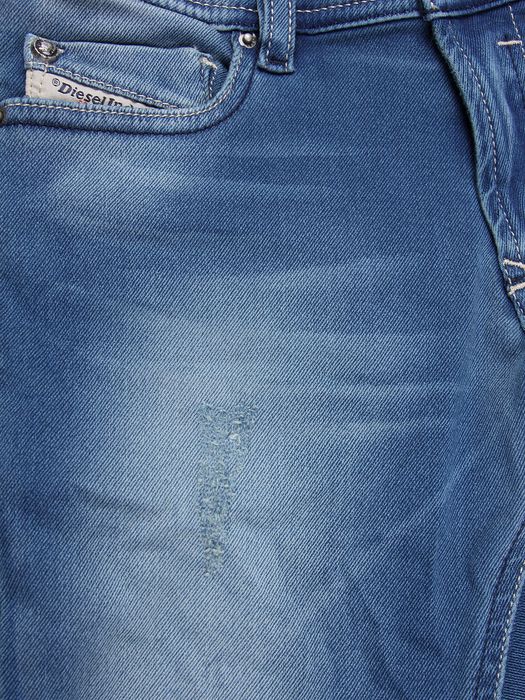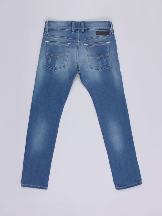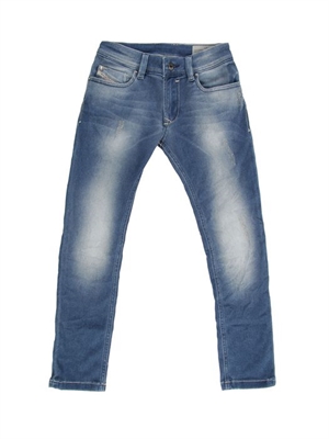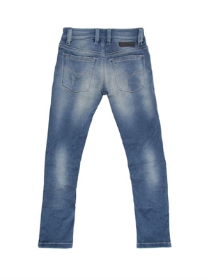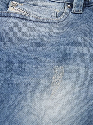 Five pocket set, blue sweat denim fabric with cavalry weave construction, logo detail.