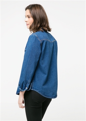Sobrecamisa denim en color tinta con dos bolsillos de solapa en el pecho. Cierre de botones a presión, manga larga con puños abotonados y bajo redondeado.
