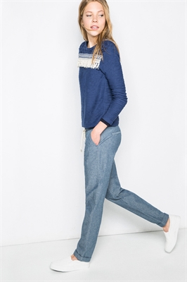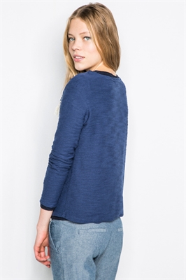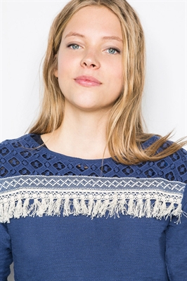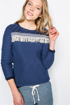 Sudadera de cuello redondo, con manga larga, con detalle de crochet y flecos en la parte delantera superior.