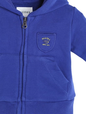 Hooded neck, long sleeves, logo print to chest and back, zip/zipped opening, side pockets, rib knit cuffs and hem.