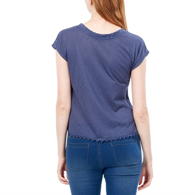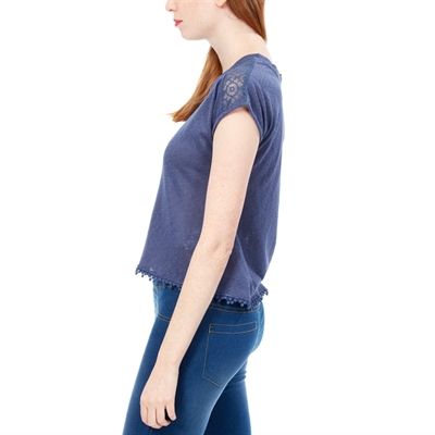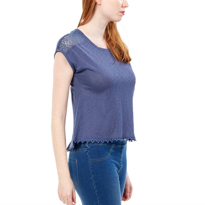 Una prenda muy femenina grarcias a los canesúes de encaje. - Top corto - Manga corta - Cuello redondo - Confeccionado en punto fino flameado - Con canesúes de encaje en los hombros - Bajo con pompones de crochet - Largo de espalda: 57 cm. En la imagen, la modelo lleva una talla M y mide 1,77 m.54% algodon,43% poliester,3% poliamidaLavable a máquina.
