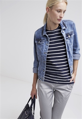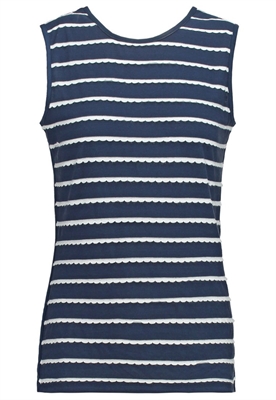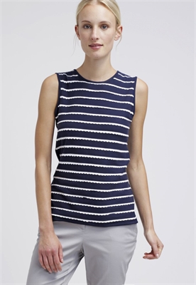 Largo:normalAjuste:normalMaterial/composición:jerseyModelo, altura:178 cm, lleva la talla 36Cuello/escote:cuello redondoOcasión:tiempo libreEstampado:de rayasLargo de la prenda:62 cmLargo de manga:sin mangasMaterial exterior:65% algodón, 35% viscosaCuidados:lavar a máquina a 40 °C, no utilizar secadoraNúmero de artículo:DP521E0AR-K11