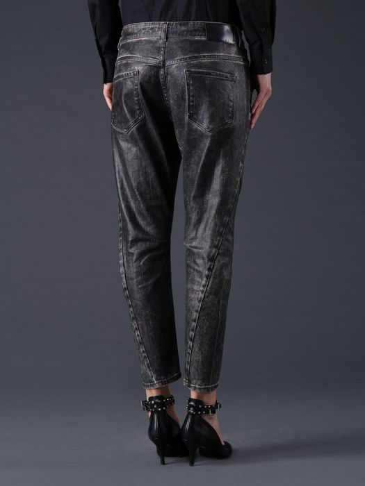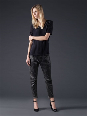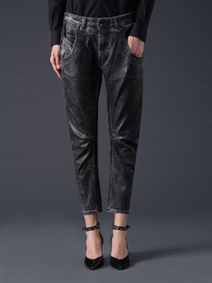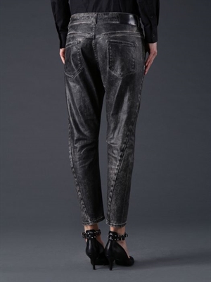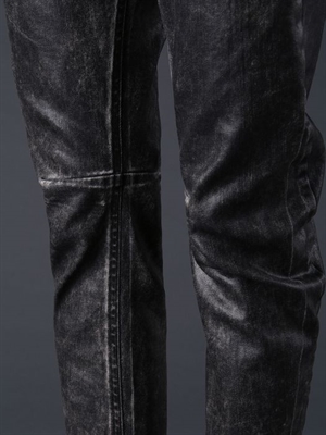 Superstretch acid wash black denim is coated with a leather-like treatment and cut into a carrot fit with twisted legs.