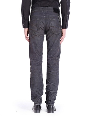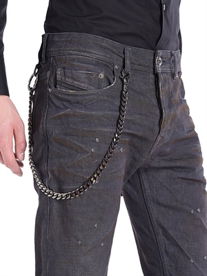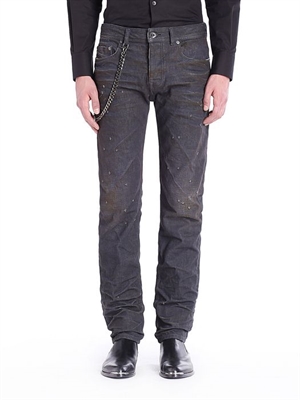 Japanese denim is made on old vintage Toyoda shuttle looms. The weaving processes are much slower than on modern machines. It is actually the variation and imperfections of the weaving process that lend character to the best Japanese denim. Authentic vintage japanese denim with 3d effect and hand applied small abrasions. Slim fit. Leg opening: 17,5 cm. Metal chain and special packaging and labeling