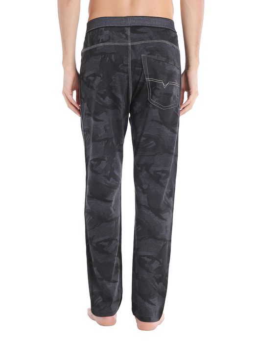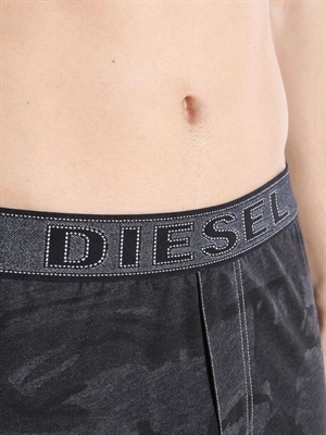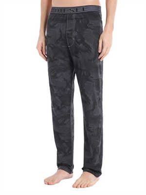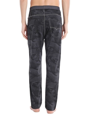 Camouflage fabric, elastic waistband, single back pocket, signature branding.