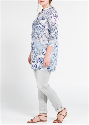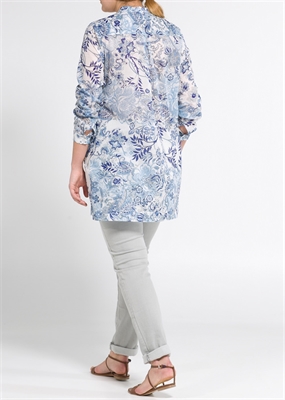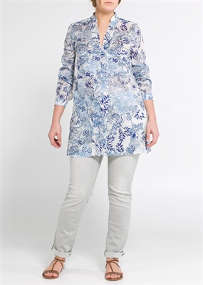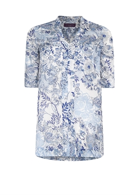 Vestido camisero con estampado paisley confeccionado en algodón. Escote de pico y dos bolsillos de parche en el pecho. Manga larga abotonada con trabilla para remangar y bajo asimétrico con aberturas laterales.