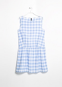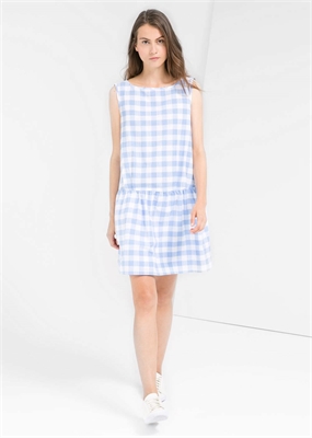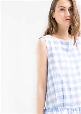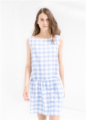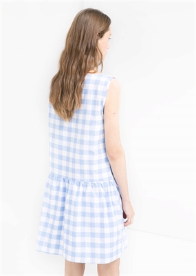 Vestido sin mangas de cuadro vichy confeccionado en algodón. Cuello redondo, cintura elástica y forro interior.