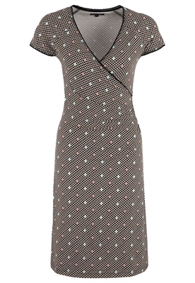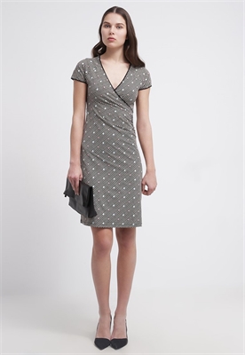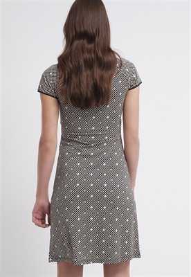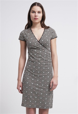 Largo:por la rodillaAjuste:ceñidosMaterial/composición:jerseyModelo, altura:179 cm, lleva la talla SCuello/escote:pico cruzadoLargo de la prenda:98 cmLargo de manga:manga extracortaMaterial exterior:95% viscosa, 5% elastanoCuidados:no utilizar secadora, lavar a máquina a 30°C, programa delicadoNúmero de artículo:KL221C045-Q11