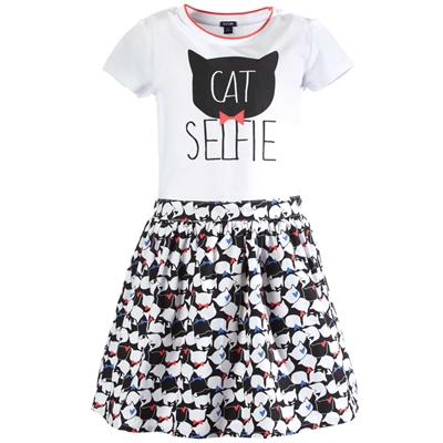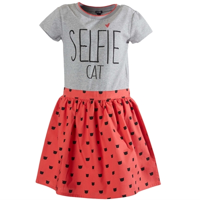 ¡Un vestido colorido ideal para el verano! - Vestido de dos tejidos - Manga corta - Cuello redondo de punto de canalé - Estampado delantero 'Selfie Cat' - Falda de popelina con motivo de gatosENCIMA 96% algodon,4% elastano MATERIA 2 100% algodon FORRO 65% poliester,35% algodonSe puede lavar a máquina.