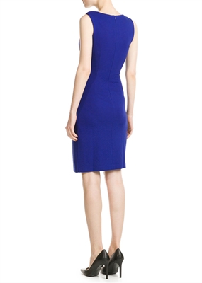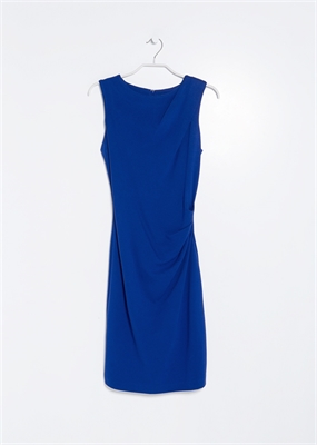Vestido sin mangas en tejido elástico con detalles drapeados. Cuello redondo, cierre de cremallera en la parte posterior y forro interior.