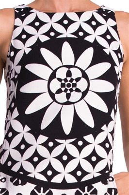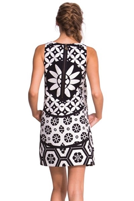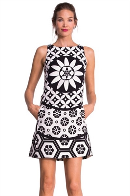 Vuelven los prints geométricos en blanco y negro de la línea diseñada por Mr. Christian Lacroix. Este vestido tipo pichi es de un tejido de muy buena calidad, de tacto grueso pero muy fresco para el verano.
