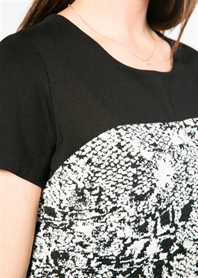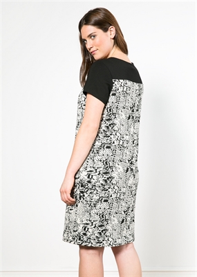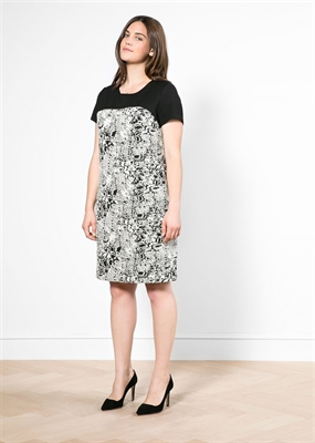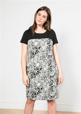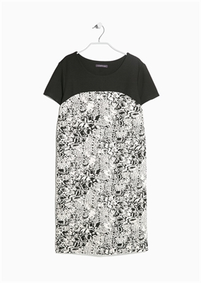 Vestido recto en tejido jacquard con textura con panel superior de punto en contraste. Cuello redondo, manga corta y forro interior.