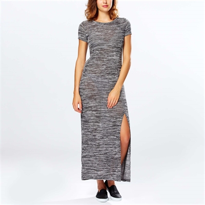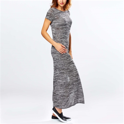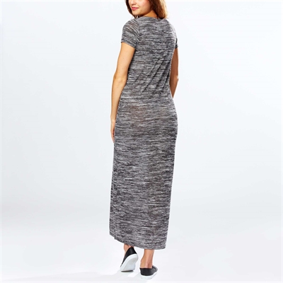 Este vestido largo con abertura te conquistará. - Vestido largo confeccionado en punto jaspeado - Cuello redondo - Manga corta - Abertura en el bajo - Largo de espalda: 138 cm aproximadamente - Nuestra modelo lleva una talla 38 y mide 1,77 m52% poliester,46% viscosa,2% elastanoLavable a máquina.