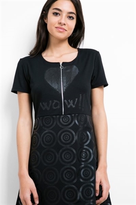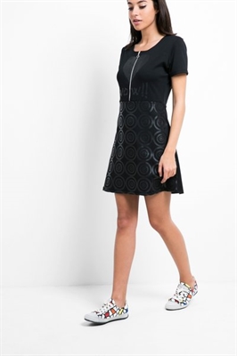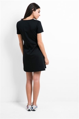 Un vestido negro mini de manga corta, fit slim, con falda evasé y cremallera juguetona. Para noches en las que perderse, y dejarse encontrar.