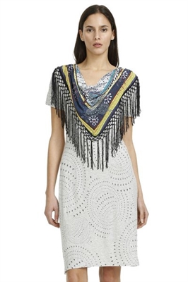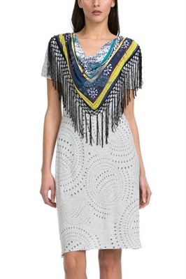 Fíjate en el cuello de este vestido, tiene diferentes texturas, colores y ¡flecos! Le dará luz a tu sonrisa y frescura a tu piel (100% viscosa). Ey, pero no te olvides de sonreír.