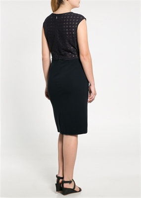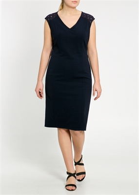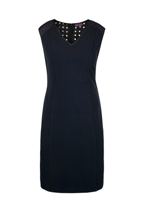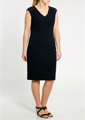 Vestido sin mangas confeccionado en tejido elástico con panel de guipur en contraste. Escote de pico, cierre de cremallera y gancho en la parte posterior, forro interior.