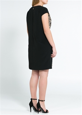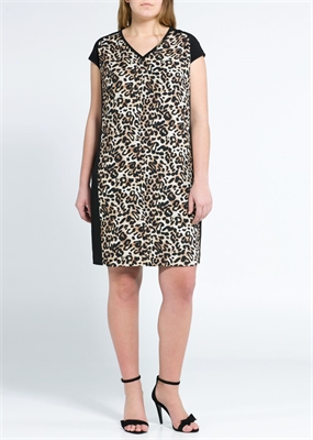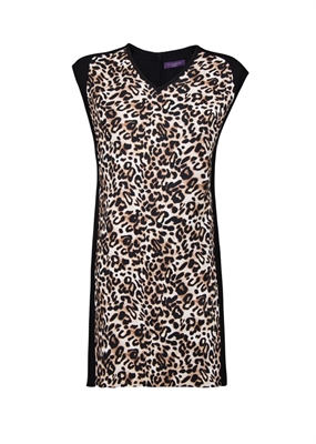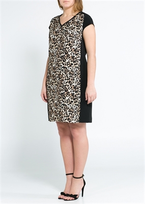 Vestido recto con estampado de leopardo en la parte delantera. Escote de pico y manga corta. Cierre de cremallera y gancho en la parte posterior, forro interior.