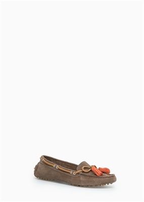Zapatos driver de serraje, borlas decorativas y suela de goma. Horma adaptada para mayor confort.